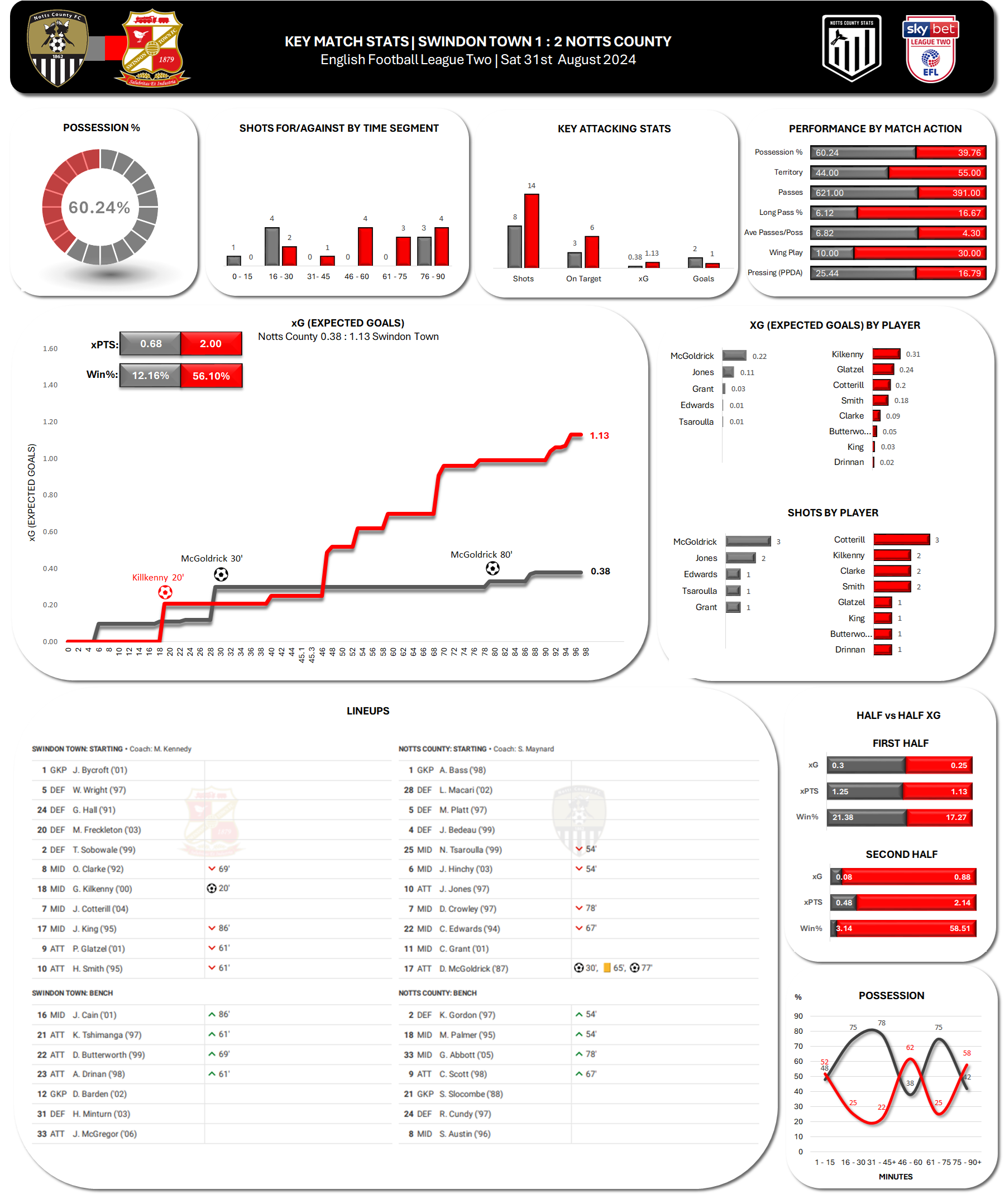Something strange is happening with this Notts team. The second half data suggests Swindon should have bagged all 3 points but somehow, Notts managed to not only take an unexpected lead but defended it in a manner we are not used to seeing of late.
