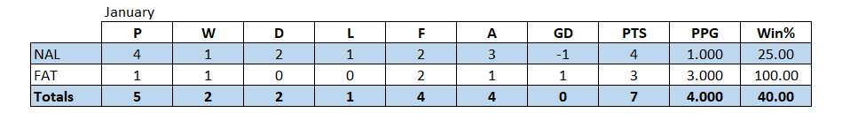 Notts would finish January in 7th place with 47 points averaging 1.516 PPG.