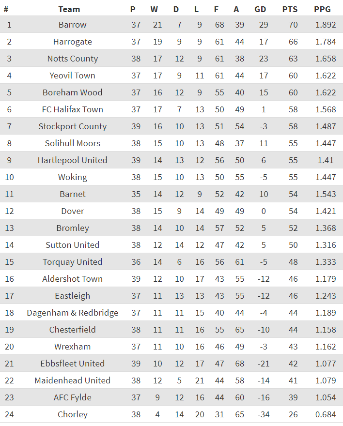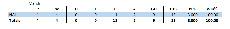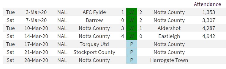Notts would win 4 from 4 in March meaning they finished the season in 3rd place on 63 points and an unweighted PPG of 1.658.