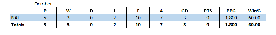 By the end of the month Notts were in 7th place on 9 points with a PPG average of 1.800.