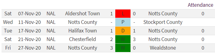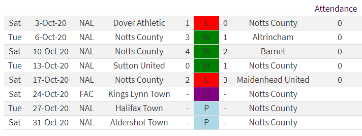 With 8 games scheduled for October only 5 were completed due to Covid with Notts having to forfeit the FA Cup game at Kings Lynn and the league games at Halifax and Aldershot postponed.