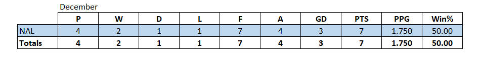 December added 7 points to Notts league tally seing them finish the year in 5th place on goal difference over Maidenhead with 23 points and a PPG average of 1.640.