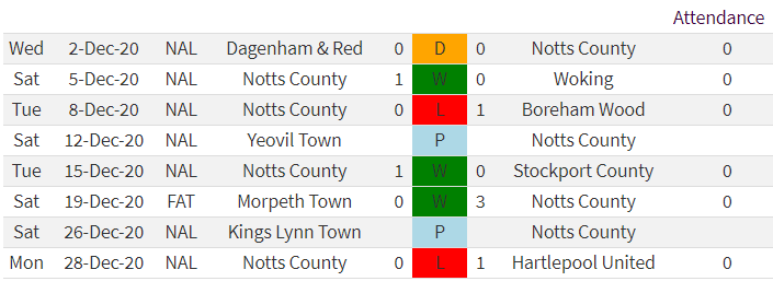 As the stop/start season continued into December Notts were staring down the barrel of 8 games in 4 weeks, however, two more postponements would mean 6 games would be played culminating in a home defeat to Hartlepool in the last game of the year.
