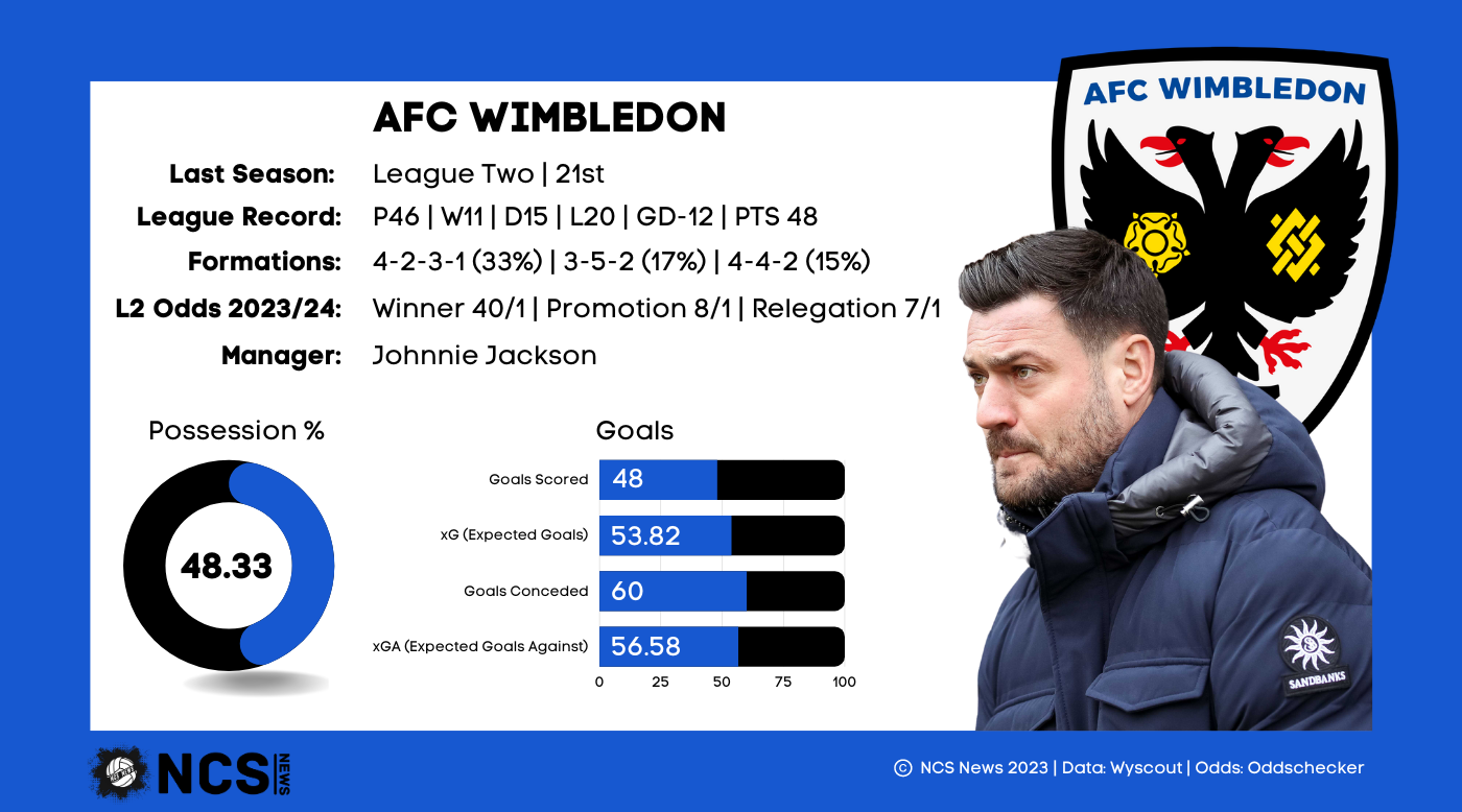 Another side who ultimately had a disappointing season. The Dons will have been hoping to bounce straight back after their relegation in 21/22, or at least have a better go at doing that than they did last season. They finished 21st, just 5 points clear of safety, something only ensured by a strong start to the campaign. As finishes to a season go, it can’t get much worse than Wimbledon's. In the 19 games they played between February and May they won just 1, drew 6, and lost 12. Those 9 points ultimately proved crucial, but when you consider they dropped 48 points during that time, it doesn’t make for pretty reading. The xG data makes for slightly better reading. They underperformed in front of goal, scoring 48 from an xG of 54, and they also underperformed while defending too, conceding 60 despite only having an xG against of 56.74. They’ll be hoping they get closer to those figures in order to improve this season.