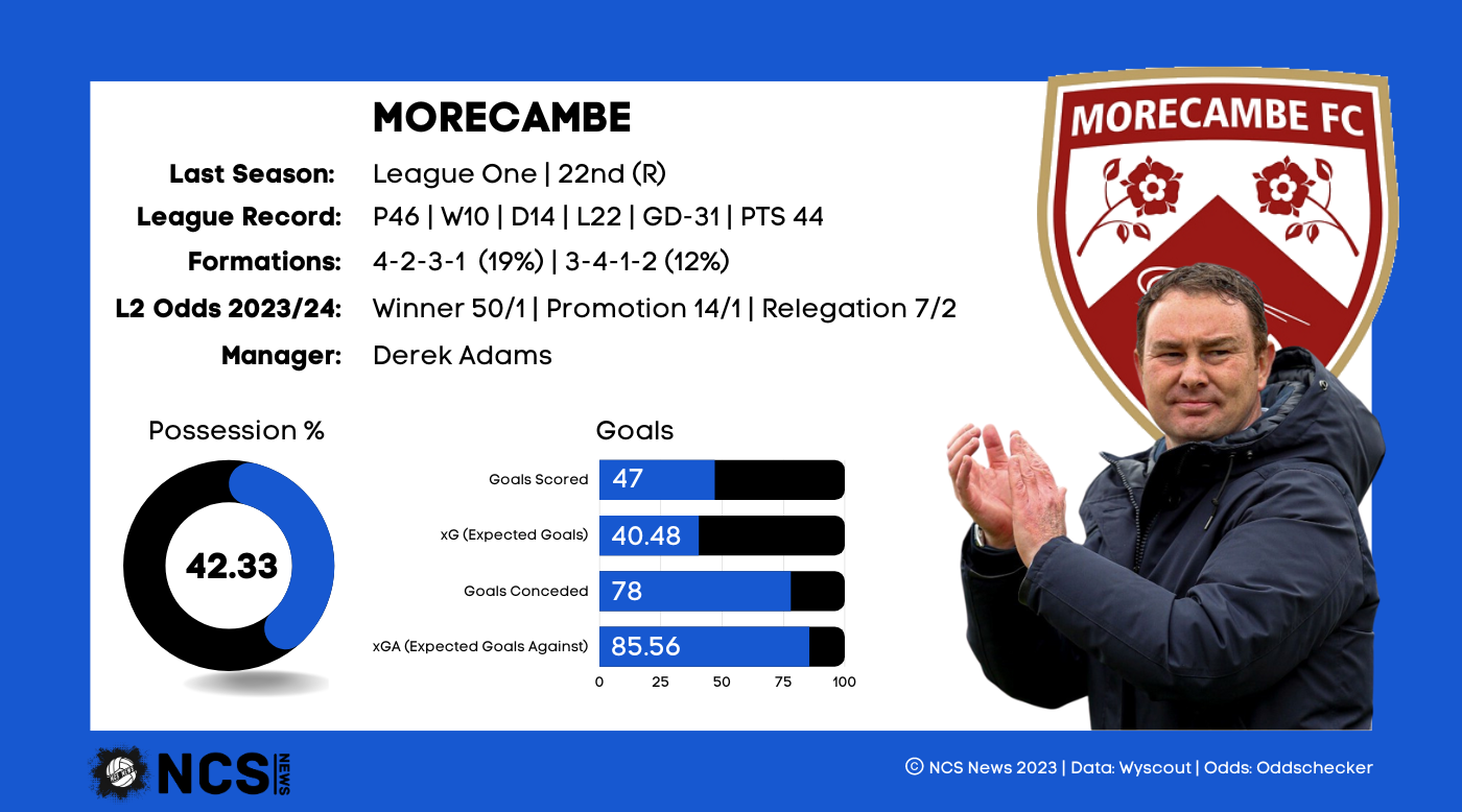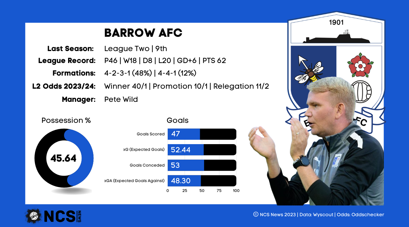 One of the surprise packages of last season, Barrow finished a very respectable 9th, although a few bad patches of form cost them any genuine chance of a playoff push. Still, considering their previous 2 campaigns in the EFL concluded with the Bluebirds finishing 21st and 22nd, the improvement is remarkable. The achievement is made even more impressive considering they had a 38 year old manager, Pete Wild, who’s only previous experience managing in the EFL came during a 3 month spell with Oldham in 2019. His side shocked promotion favourites Stockport on the opening day, with a 3-2 away win, and since then they didn’t really look back. They also underperformed on xG, suggesting their league position could have been even better; they scored just 47 times from an xG of 52.33, while they conceded 4.88 more than their expected total of 48.12. In fact, their xG against was 19th lowest in the league, highlighting their strength in limiting opposition chances. However, despite the positives, Barrow were the only side in the top 10 with a negative goal difference, and it will require some effort to improve upon a great 22/23 campaign.
