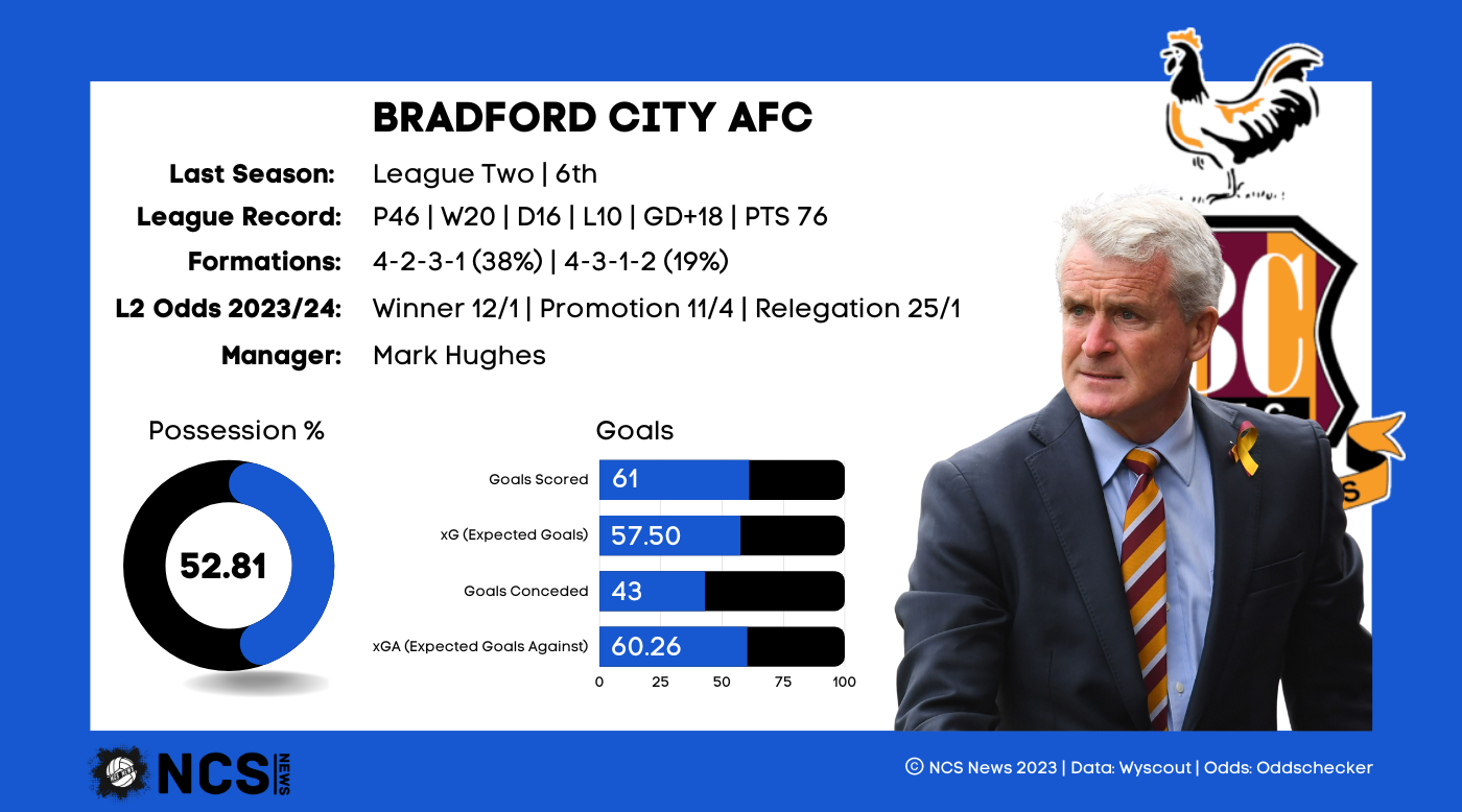 It’s difficult to truly assess Bradford’s 22/23 season. They finished in the playoff places, which when you consider the strength of League 2 is an achievement. However, they ultimately failed in their objective, with Mark Hughes unable to provide the promotion the Bantams so desperately crave. With the landscape of League 2 this season, you’d have to say that task has become even more difficult, but you would still consider the Yorkshire side one of the firm favourites. Bradford are well backed, and will be looking to build upon their 6th place finish from last season. They’ve already made 6 additions, and with a manager of the profile of Mark Hughes, it’s difficult to see them stopping there. Bradford are an overwhelmingly impressive side; they both scored the 5th most goals, kept the 5th highest possession and conceded the 5th fewest too. Offensively, they performed almost exactly as you would have expected last season; they scored 61 goals, just 0.79 more than their xG. However, defensively, the data suggests that the Bantams rode their luck at times. They conceded on just 43 occasions, despite having an xG against of 62.72. That’s a massive overachievement, so it’s perhaps no surprise Hughes has brought in defensive reinforcements, despite having the 5th best defensive record in the league.