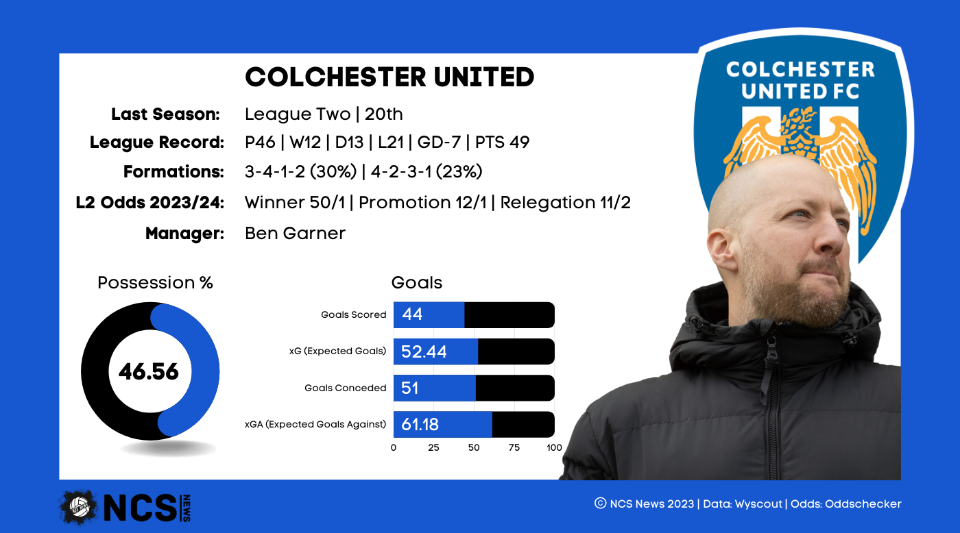 The U’s finished 6 points above the precipice, despite having by far the best defensive record in the bottom 7. In fact, they had the 4th best goal difference in the whole bottom half, such was the strength of their defensive performances. It was going forward where Colchester struggled, with their 44 goals the least in the bottom 7. In fact, only Gillingham scored fewer in the division as a whole, and, along with Tranmere, are the only other side to average less than a goal per game. Colchester’s offensive woes are made even worse by the fact that 14 of their 44 goals came across 4 games, meaning they netted just 30 in the other 42. Positive things must be on the horizon for the U’s though, as since the arrival of new coach Ben Garner in March 2023, they have averaged 1.08 goals per game, and in that 12 game period they fired 4 past their opponents on 2 occasions. Garner is a possession based, attacking coach, and while it’s a limited sample size, the early signs are clearly there to see. Optimism must be rife therefore in Essex, as with a full pre season you would expect Garner to produce even more tangible results. He stuck with the 3-4-1-2 system he inherited, and it will be interesting to see if he persists with it this season, or if he looks to add his own style of play. Either way, Colchester will be aiming to finish higher than their 20th place finish, and their fans have some cause to believe they will do so.