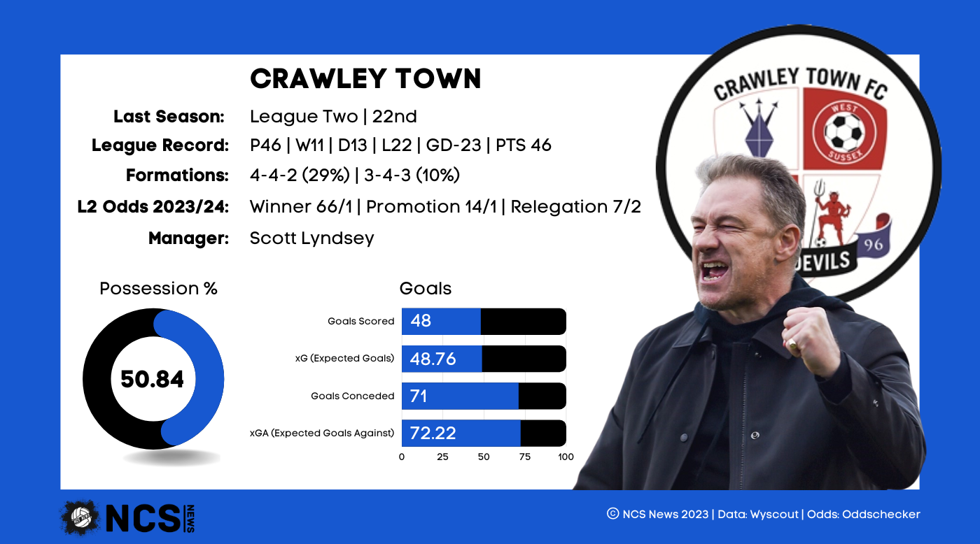 Crawley were the side that benefited from the fact that League 2 only has 2 relegation spots, as they finished 22nd on just 46 points. It did look a lot bleaker than that for some time, but they hit form at the right time, with 5 of their 11 wins coming in their final 13 games. This included an ultimately decisive 2-0 away win over Hartlepool on the 3rd to last game of the season, the side that ended up facing the drop instead. This was only their 2nd away win of the whole season; no side picked up fewer than their 12 points on the road. It was a season of turmoil for the Red Devils, as they had 5 different men in charge throughout the season, the lack of continuity undoubtedly damaging their season. Alleged off the field antics involving club owners WAGMI didn’t help, and it was only after the arrival of Scott Lindsey that their fortunes began to turn, unsurprisingly when you consider he was the man in charge for by far the longest period. His appointment in itself was something as a shock, as he left 8th placed Swindon in order to take over the Sussex side. He will need to continue to improve the side, especially defensively. Only relegated Hartlepool conceded more than their 71 goals, a tally which was 1 higher than the other relegated side Rochdale. Perhaps concerningly, their xG against was 72.12, suggesting their poor defensive record was exactly where it was expected to be. They were even closer to their xG for, with 48 goals coming from an xG of 48.72, which means something drastic will have to change for Crawley’s fortunes to improve this season.