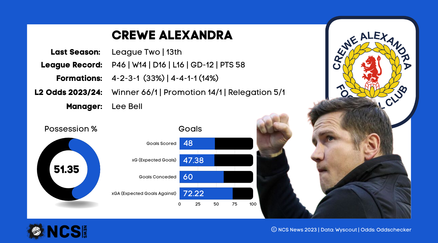 Middle of the pack is the best way to describe Crewe’s 22/23 season, and not just in terms of league positioning. They finished 13th, level on points with both 12th and 14th, they scored the joint 14th most goals and kept 12th most possession. Defensively they were slightly below par, conceding the joint 6th most in the league, the most of any side who finished 17th or above. Things could have been even worse for the Railwaymen though, as they had the 2nd highest xG against in the whole league. In fact, they overperformed their xG against total by a massive 12.19, suggesting they would expect to concede more this season, should the same level of chances be given to the opposition. If they are to improve next season they will need to work on the quality of chance conceded, so it’s perhaps surprising they’ve only added 2 defenders, right back Ryan Cooney from Morecambe and central defender Mickey Demetriou from Newport. Crewe were also the only side in the whole division who drew as many games as they lost, finishing the season with 14 wins, 16 draws and 16 losses; about as mid table as it gets. They will also need to turn some of those draws into wins; they were the only side in the top 14 who drew more games than they won, a statistic they’ll need to rectify if they are to break into the top half.