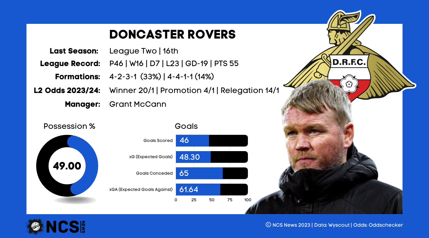 Doncaster will have wanted to bounce straight back after being relegated in 22/23, so to have finished 18th will have been a massive disappointment. The best indication of this is that boss Gary McSheffrey was relieved of his duties in October, with the club in 12th place. Clearly they had ambitions of at least reaching the playoffs, but the move ultimately backfired, as Danny Schofield, the man who replaced him, won just 10 of his 33 games in charge, leaving Rovers finishing 8 points closer to the relegation places than they did the promotion spots. They were never in any danger of facing the drop, but it was certainly a season to forget, as they scored the 18th fewest goals, had the 21st lowest xG, conceded the 5th most goals and had the 9th highest xG against. This season marks a new beginning for Doncaster though, with former boss Grant McCann making a return to the club. Optimism is high, and understandably so, with the club bringing in a litany of new recruits alongside their new manager. They’ve had one of the most impressive windows in the league, so it certainly feels like a new start for the club. It’ll largely be a new look side too, so the woes of last season will be firmly behind them.