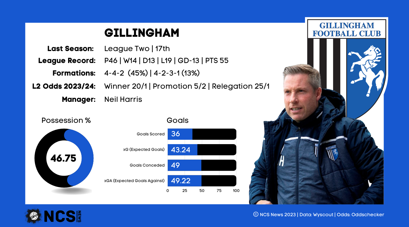 Former Cardiff and Millwall boss Neil Harris has had a tough time as Gillingham manager, first with relegation in 21/22, and then an underwhelming campaign in 22/23. It’s testament to his character, as well as the credit he has in the bank due to his career, that he’s still at the helm, and he will feel he can lead his side back to the level he took them over at. Tactically Harris was consistent across the season, tweaking the system slightly, but often favouring a 4-4-2 formation. The sudden upturn in results then can be attributed to 2 things; the Gills exiting cup competitions, and the arrival of Timothee Dieng from Exeter City. Dieng made an immediate impact, scoring and assisting in 2 of his 3 opening games, and for this Harris deserves immense credit for his ability to recruit. To lure a man who had won promotion with Exeter in 21/22 to a side at the foot of the table speaks volumes about the pull Harris possesses at this level. He’s continued that this season, winning the race for Jonny Williams’ signature, once again showing how strong his recruitment skills are.