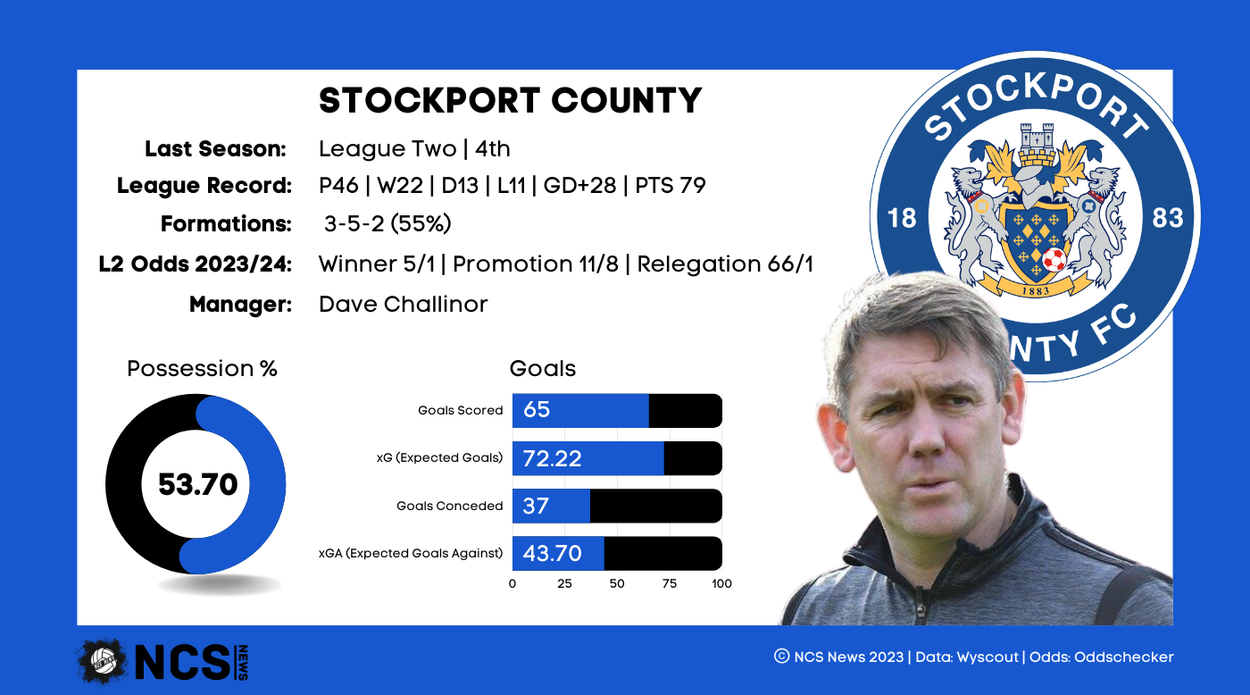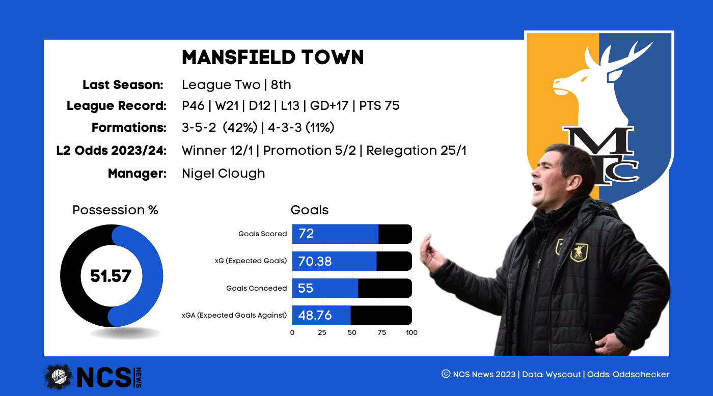 One of the most high profile managerial names in the division, Clough has been in charge of the Stags since 2020. He was manager of Burton Albion for 5 years directly prior to his appointment, where he earned promotion from League 1 in 2016. It’s been a pretty barren spell since in terms of tangible success, and the 57 year old will be desperate to rectify that this season. Clough has kept the vast majority of the squad’s core together, with only a few departures of players on the periphery. He has lost loan defender Riley Harbottle, but made the loan signing of Will Swan permanent, so Clough’s pulling power is still evidently high. Clough has favoured experienced players, with 7 players over the age of 30 making 22 or more appearances last season. The top 6 minutes makers of last season were 28 or above, 4 of which were over the age of 30, with Mansfield having the 3rd highest average age of squad across the entire division. It’s encouraging them that his 6 signings have an average age of 26.33, showing he’s looking to lower the average age of the side.