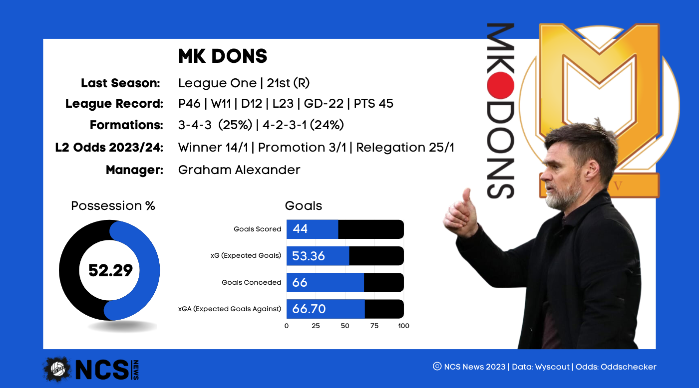 The Dons were victims of the 4th relegation spot, as they finished 21st, which in any of the other EFL divisions would have seen them survive. They finished on 45 points, 1 point adrift of safety, despite the fact they scored more and conceded fewer than 20th placed Cambridge. In fact, only 2 sides conceded fewer than MK in the bottom 11 teams, and their 66 goals conceded was the same amount as 10th placed Charlton. Their problems were undoubtedly in front of goal, with only relegated Forest Green and Morecambe, as well as the aforementioned Cambridge, scoring fewer goals across the campaign. This becomes even more worrying when you consider striker Mo Eisa scored 25% of their goals; without him they’d have only netted 33. They’ll be desperate to keep hold of him this summer, in what promises to be a campaign of change. They’ve not only appointed a new manager, highly rated Graham Alexander, but they’ve had a mass clear out, letting over 10 players go, while assembling a new look squad. With a manager with Alexander’s promotion experience, as well as a host of exciting new additions, MK Dons fans will be optimistic about this season.