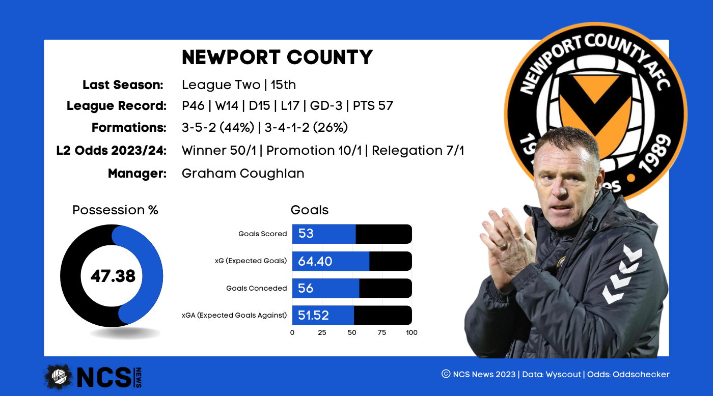 Newport are no longer the only Welsh side in the division, but more than 3 hours separate them with newcomers Wrexham, and they are very separate in the way they are run too. Fan owned County had a very respectable 22/23 campaign when you consider their resources, as a 15th placed finish secured their EFL status for another season. There were plenty of positives for the Exiles last season, as they had the best goal difference in the bottom half, and were the 2nd top scorers in that bottom 12 too. In fact, they scored 6 more than Barrow who finished 9th, and 4 more than Grimsby who finished 11th, so certainly going forwards there was plenty to shout about. Much of this owed to striker Omar Bogle, who top scored with 17, so the Exiles will be jubilant that they have managed to secure his services ahead of the new season. Defensively Newport weren’t poor either; they only conceded 2 more than 7th place Salford, 1 more than 8th placed Mansfield and only 4 sides in the bottom half boasted a better defensive record. However, their defence has been completely decimated, with 4 of their first choice back 5 departing for pastures new, all to rival sides within the same division. Boss Graham Coughlan faces a difficult task therefore in motivating a side which has been picked apart by teams with more financial muscle.