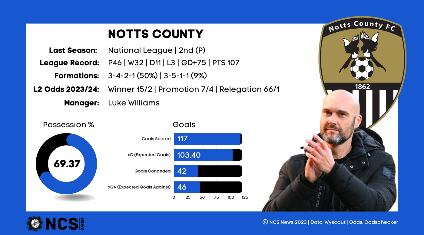 The Oldest Football League club are now the Newest Football League club. In typical Notts fashion it was a rollercoaster to get there, with a dramatic playoff campaign which culminated in a trophy lift at Wembley. It was redemption on many levels, Notts’ 4th attempt in the National League playoffs, the 1st of which had ended in defeat at Wembley, behind closed doors. It was also a season in which they fell short in the title race, but produced when it mattered to secure their return to the EFL after a 4 year hiatus. That competitive rivalry with Wrexham may be reignited this season, but with 3 automatic promotion spots we’re unlikely to see such a fiercely contested title race again. It was a season in which many records were broken, including the longest unbeaten run in the club’s history, and the most points too, breaking the 100 point barrier for the first time, finishing with 107 points, which incredibly was 4 short of the title. And while it was a season which ended in 2nd place, it was a campaign that actually saw Notts top chart after chart. They scored the most goals in the top 5 divisions, 117, the highest Expected Goals, 107.2, and the highest average possession in the country too, 70%. Notts’ tenure in the National League was characterised by stylish football, but the arrival of head coach Luke Williams showed that attractive football can be effective too; he produced tangible results, and will be looking to do the same again this season.