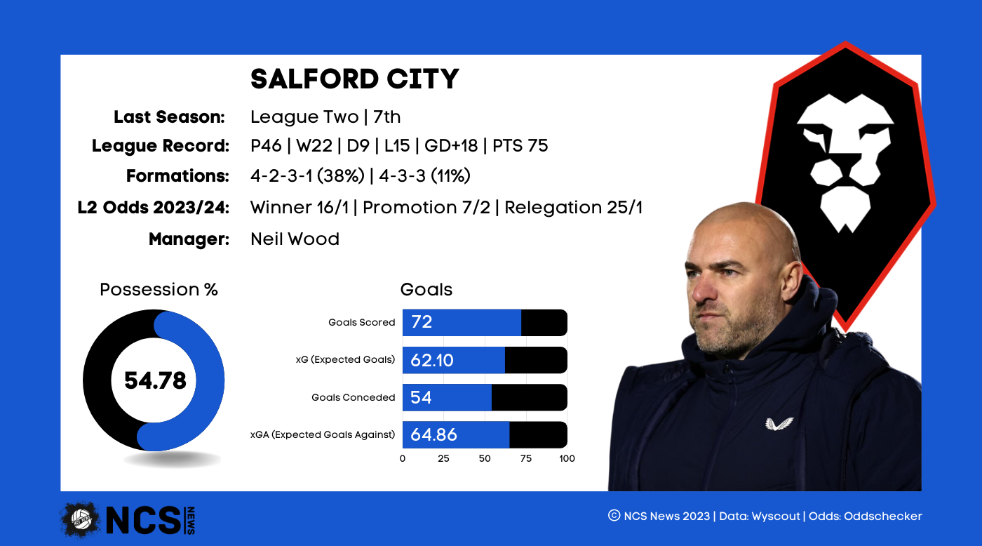 Defeated playoff semi finalists Salford City will be looking to finally get out of League 2, a division they’ve been in since their promotion from the National League in 2019. It’s been a journey of consistent improvement since then, with 22/23 the first time they managed a playoff finish, one which they only achieved on the final day, and by a single goal. It’s a step in the right direction, but when you consider both the backing and the ambitions of those doing the backing, Salford might have expected their rise through the leagues to have been slightly quicker. It was still a decisive season for Salford; only 2 sides drew more games than the North West side. Only 3 sides won more games than Salford too, all of which finished in the 3 automatic spots. They were also the division’s joint top scorers, along with Mansfield who they beat out for the final playoff spot, an opportunity they almost grasped, only to lose on penalties to eventual defeated finalists Stockport. Their issues however were undoubtedly in front of goal; they conceded 11 more than any other side in the top 7. If they can sure their defence up, something they’ve looked to address in the transfer market, then there’s no reason why they can’t compete again this season.