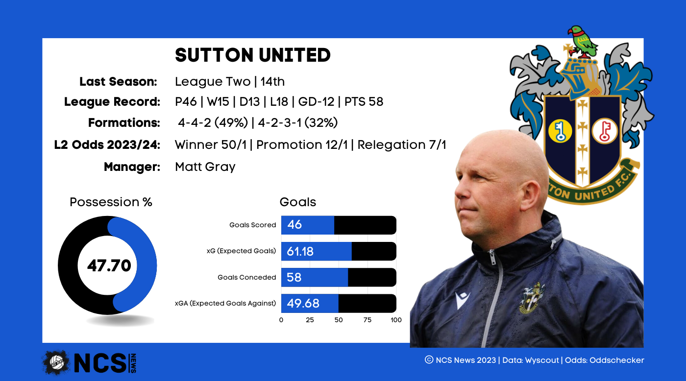 On paper, a 14th place finish for a side who only entered the Football League in 2021 would be something of an achievement. But when you consider they dropped 6 places and picked up 18 less points, it could be seen as a step in the wrong direction. When you then consider the list of players they’ve lost this summer, things look even bleaker at the outset of what is undoubtedly Sutton’s toughest season in the EFL yet. Last season can only be characterised as an extremely patchy one. Between the 19th November and 7th March, a 17 game period, no side picked up more points than Sutton, 35. But from the 7th March til the end of the season no side picked up fewer points than Sutton, a measly 4 points. In fact, in that period no side other than Sutton failed to win a single game. They also only scored 6 goals in that time, 1 of only 2 sides to only score in single figures in that period. Sutton also lost 4 games on the bounce and 6 consecutive games during the season in 2 separate runs. Similarly they won 3 games on the spin on 2 separate occasions, so Sutton could only be categorised as streaky. They’ll need to improve their consistency this season if they are to stop themselves from slipping even further down the League 2 table.