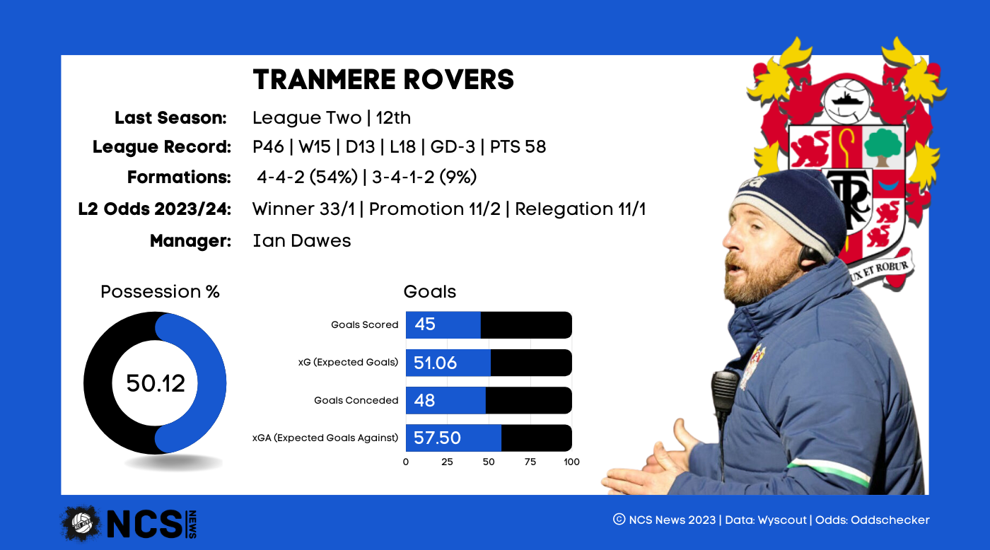 Last season wasn’t a very entertaining one for Tranmere, despite a top half finish. Tranmere fans only saw 93 goals last season, the 2nd least of any club in the league; they certainly weren’t entertainers. They had the best defensive record outside of the top 6, conceding just 48 goals, showcasing a very tight back line. However, their woes came in front of goal, where they scored just 45, the 3rd fewest in the league, and less than both relegated sides. It’s an issue they’ve clearly looked to rectify, signing 3 centre forwards, one of which scored 20 goals at this level last season. It’s quite a simple message, but if they improve in front of goal while maintaining their defensive solidity, they’ll be in with a real chance. This is of course easier said than done, especially given the defenivse losses they’ve suffered this summer. It becomes an even tougher task when you consider the underlying numbers. Tranmere had an xG against of 57.41, 9.41 higher than their actual conceded figure. This suggests they rode their luck at times this season, and if they concede the same level of chance this season you’d expect them to concede more this term. New coach Ian Dawes will have a big job on his hands to get the same defensive performances, with the jury still out as to whether Dawes is the right man for the job.