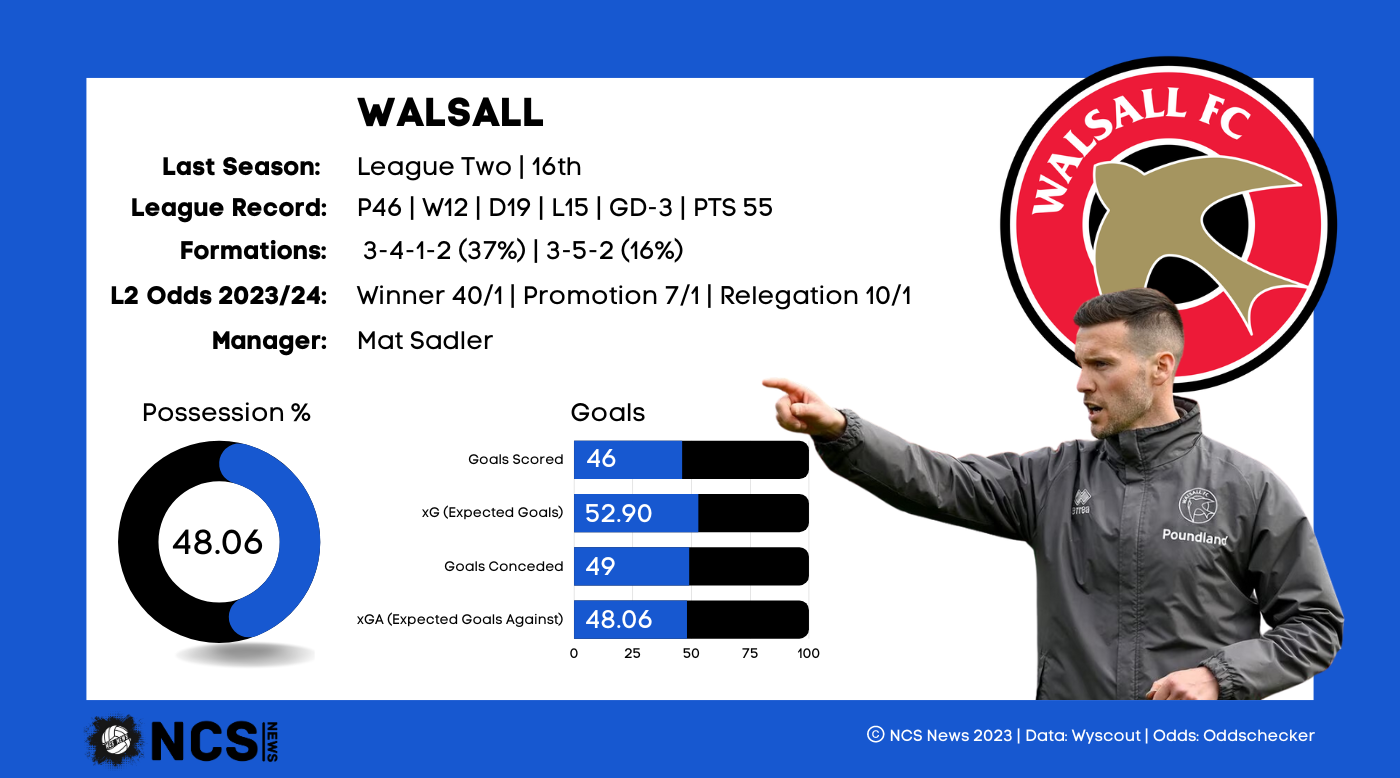 The Saddlers, led by Mat Sadler, will be optimistic that they can have a better season than in 22/23, with former player Sadler in charge for his first full season. They’ll certainly be hoping it will be a more decisive season than last term, as Walsall drew 19 games, more than any side in the league. They were a determined side, and extremely hard to beat. They had the best defensive record in the bottom half, and they lost the fewest games, 13, outside of the top 8. However, while Walsall didn’t taste defeat often, they also scarcely saw victory either. They actually won even fewer games than they lost, 12, and only the bottom 4 won fewer games last term, showing where Walsall’s problem lay. They were shy in front of goal too, scoring just 46 times, the same amount as bottom side Rochdale, with only 3 sides finding the net on fewer occasions. It’s why Walsall parted ways with Michael Flynn, now in charge at Swindon, and gave the job, on an interim basis, to former player Sadler. He certainly has the perfect name for the job, and time will tell if he is the right man to take them forward. It’ll be a season of change for Walsall, not least in the way they’ve approached the transfer market, where they seem to have finally taken advantage of their catchment area. If they can remain tough to beat they should have a decent campaign this season.