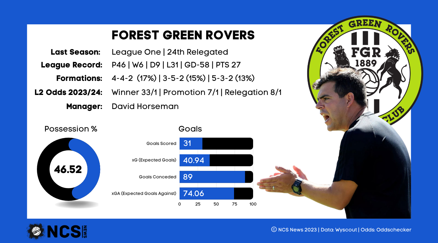 12 months ago Forest Green won promotion from League 2 as champions, yet just 1 season later they are back where they started, arguably in much worse shape. The manager who won the title for Forest Green, Rob Edwards, is now a Premier League manager, which means 3 divisions now separate Edwards and his former employers. Since then they have had 3 different Head Coaches, first Ian Burchnall, who left Notts County in the summer to take the League 1 job. That didn’t go to plan, and he was replaced by Duncan Ferguson. Things arguably got even worse under ‘Big Dunc’, with Forest Green winning just 1 game after he took over in January. Pre season preparations haven’t gone to plan either, and despite initially promising that Ferguson would stay as manager following relegation, he was relived of his duties in early July, to leave Forest Green managerless. To make matters even more interesting, Forest Green made history by appointing the first female head coach in EFL, when Hannah Dingley took the job on an interim basis. She was quickly replaced by Southampton youth coach David Horseman, taking his first senior job. In fairness, their poor season was always on the cards, as despite the fact they won the league, they were far from convincing in the 2nd half of the 21/22 season as Exeter City chased them down. This drop in form carried into 22/23 where they were by far the worst team in League 1, winning just 6 games, the only side not to hit double figures for wins in the league. In fact, they were the worst team in a 46 game League 1 season since 2010, with a tally of 27 points seeing them finish 19 points from safety. They scored just 31 and conceded 89, so they'll be hoping for a remarkable change in fortunes this term.