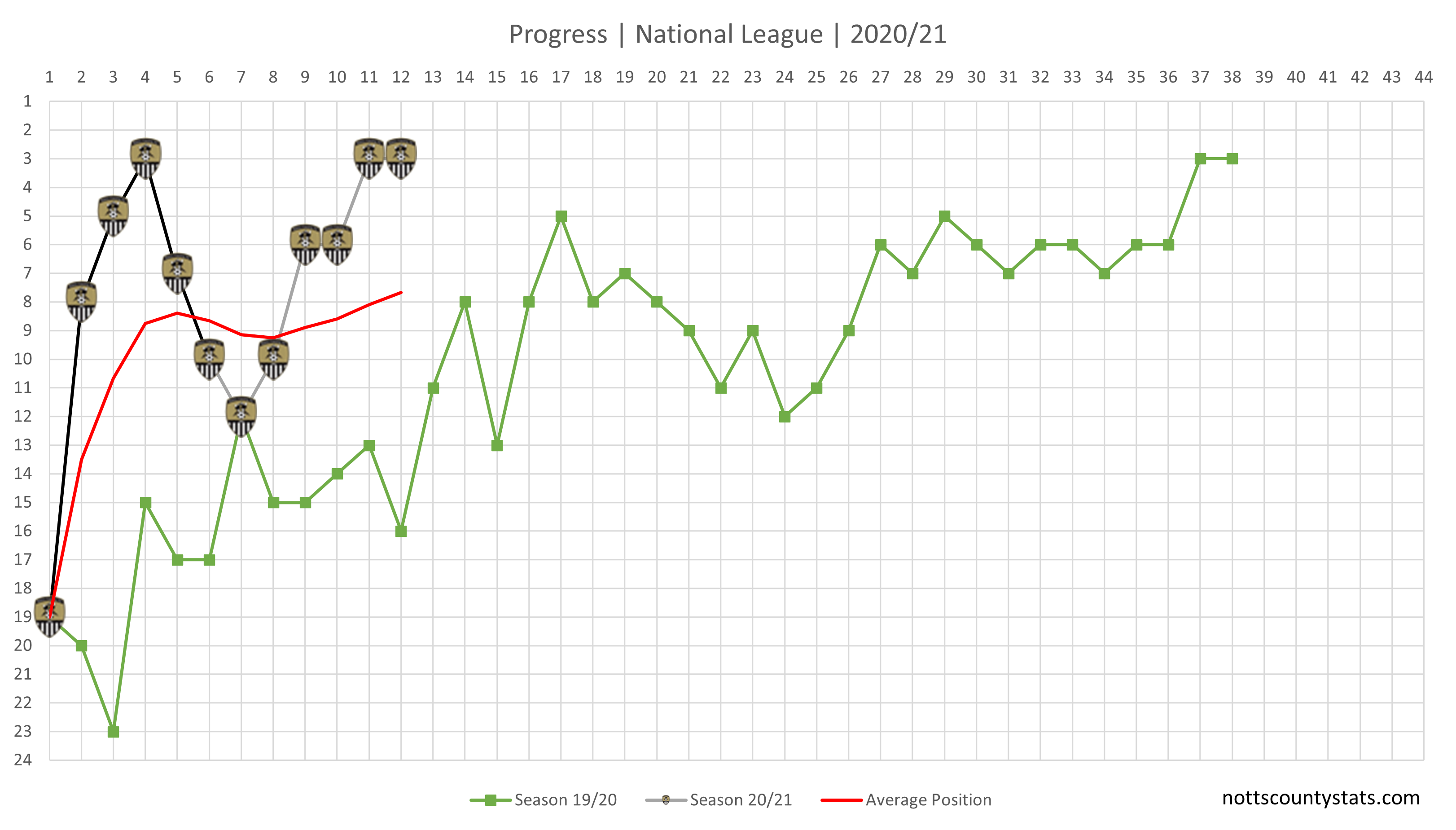 Points needed and with 12 games played Notts now have a PPG of 1.660 which would see a return of just under 73 points for 44 games which would still see a challenge for 3rd place. The predicted line in the chart is hidden by 3rd place but you can use the filters to hide/view value lines.