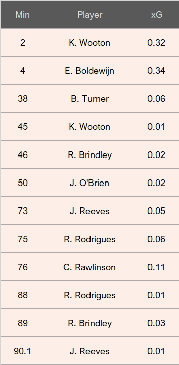 The following table shows the chances per player and the xG rating given to each chance.