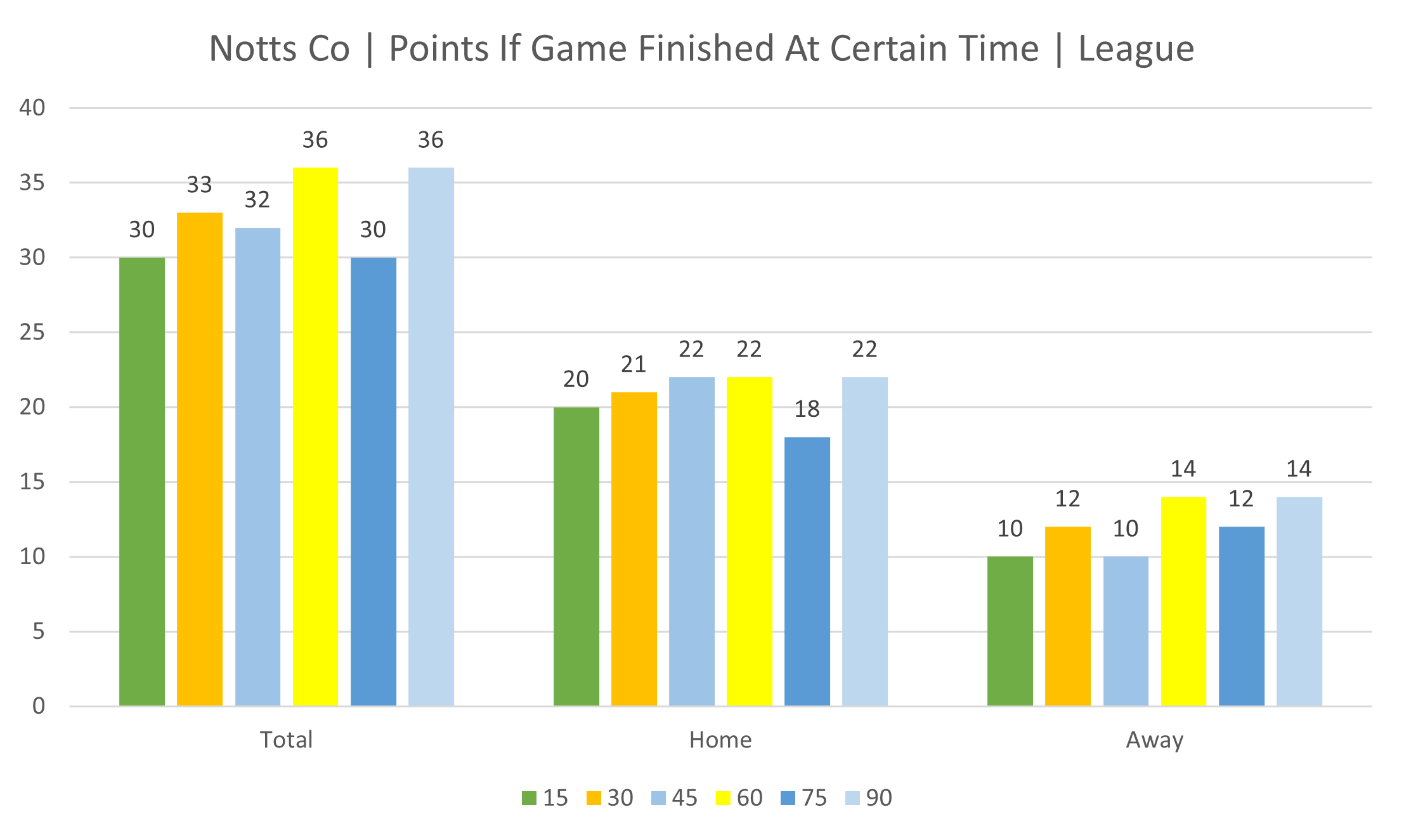 Points by time segment. How many points would have been accummulated if games had finished at 15, 30, 45, 60, 75 and 90 minutes.