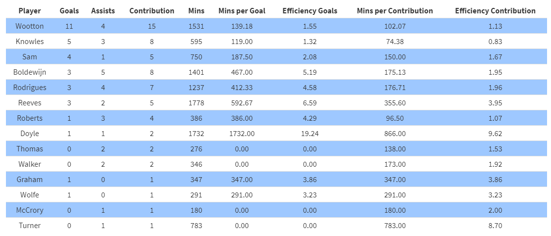 Onto player stats now and remember you can use the search function to see individual players or click on a column heading to sort highest to lowest etc.
