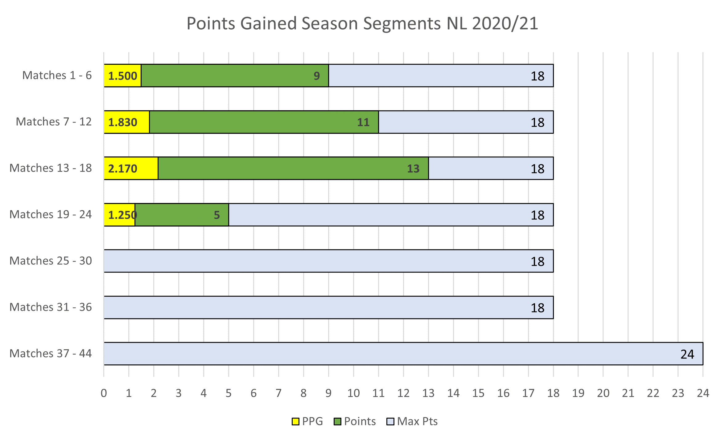 League segment chart updated. Grey bar shows total points available for that segment. Green bar shows total points gained and yellow bar the PPG for that segment.