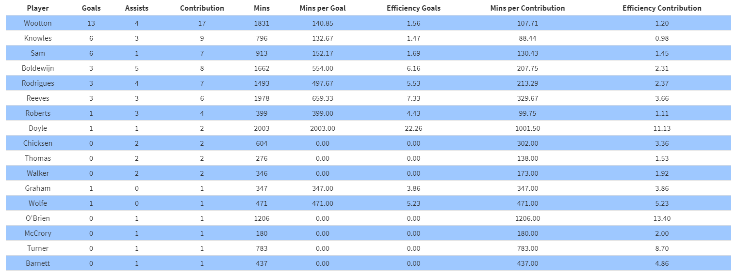 Onto player stats now and remember you can use the search function to see individual players or click on a column heading to sort highest to lowest etc.