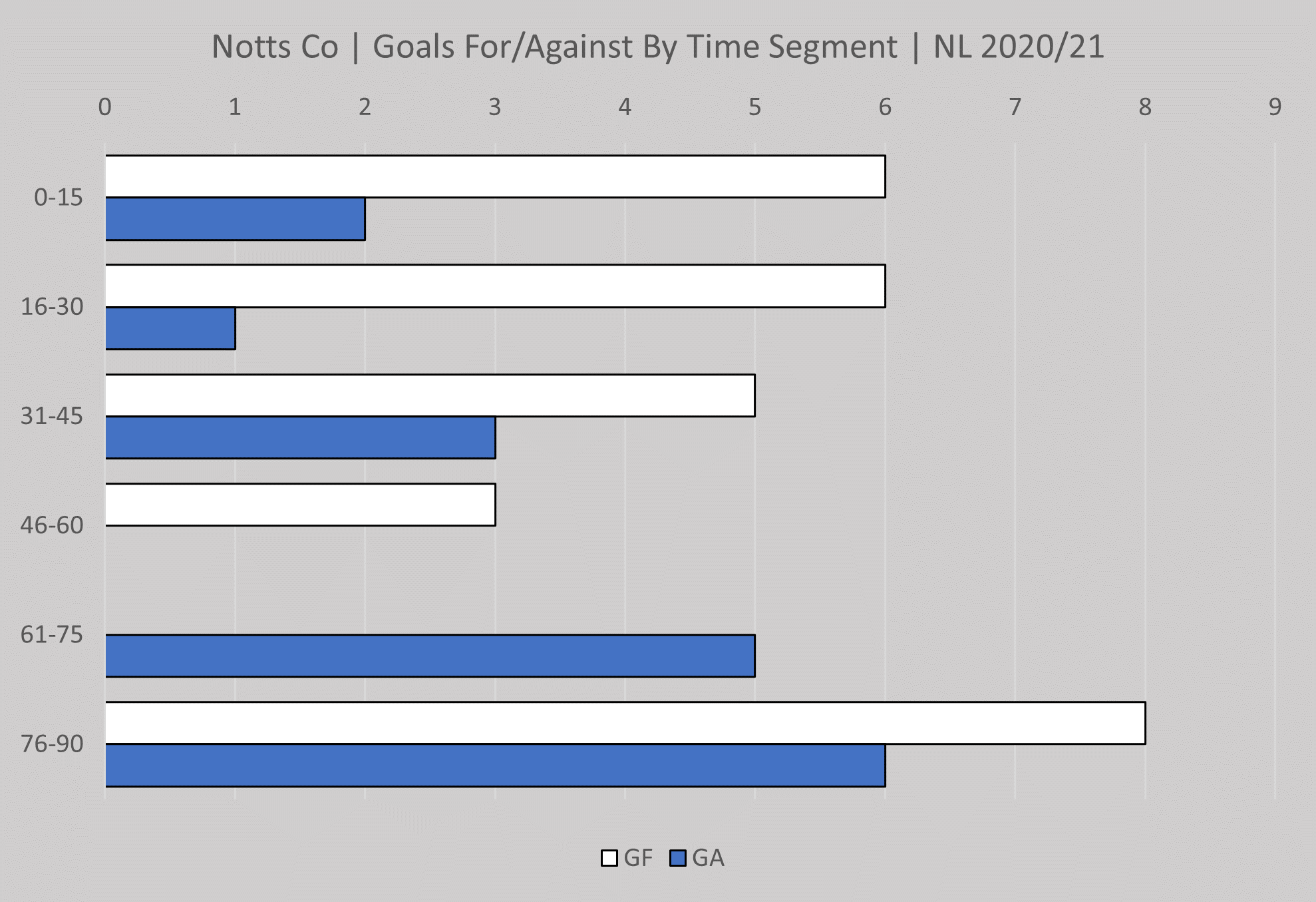 Goals by time segment updated and there is now a trend of Notts conceding goals in the latter stages of games, although there hasn't been that many conceded in general.