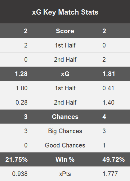 Key xG stats for the match and despite the poor start Notts had enough chances in the end to come away with all three points recording a 49.72% win probability and 1.777 xPTS.