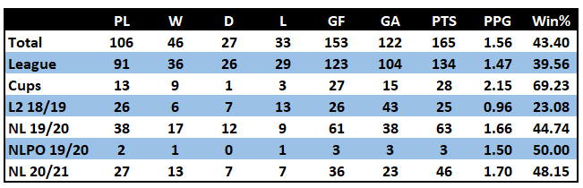 A first look at Burchnall's managerial stats wouldn't fill you with a great deal of confidence, just 26 wins in 90 games and 1.08 PPG. But I would urge you to scrape beneath the surface and it's clear to see why the Reedtz brothers thought he was worthy of a closer look.