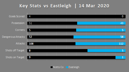 Looking at the match stats Notts came out well on top and although Eastleigh were given plenty of opportunity to threaten the Notts goal they only managed the one shot on target.
