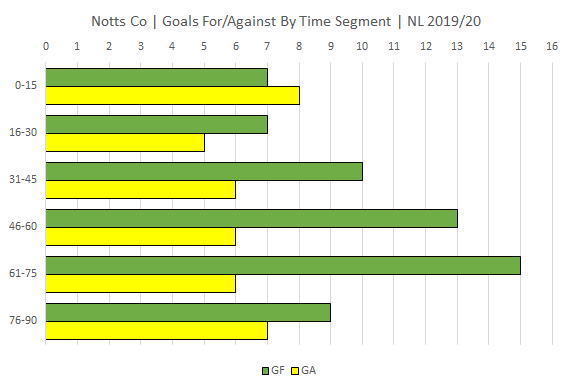 Goals scored/conceded by time segment. I've been suggesting for a few weeks now that Notts are looking stronger the longer a game goes on and that was definitely the case again against Eastleigh and further confirmed by the goal segment graph below.