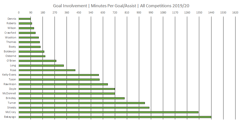 Minutes per goal involvement updated following the Eastleigh win sees Callum Roberts just behind Kristian Dennis as one of the clubs most effective players when it comes to goal involvement.