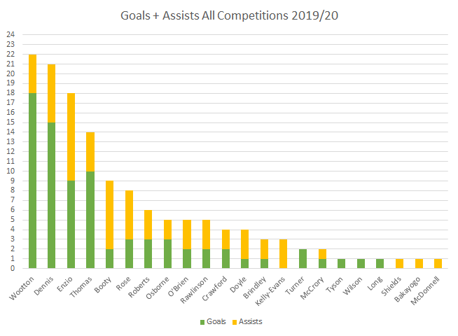Kyle Wootton continues to lead the goals + assists table after his brace against Eastleigh which now sees him with 18 goals and 4 assists in all competitions. Kristian Dennis and Callum Roberts both grabbed a goal and an assist and Mitch Rose chipped in with two assists.