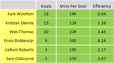 Kristian Dennis remains the most efficient striker of those scoring 2 or more goals taking 124 mins to score a goal or a goal every 1.38 games. Callum Roberts hasn't taken long to get himself on the leader board and already has the 3rd best return in terms of goals per minutes played behind Dennis and Wootton.