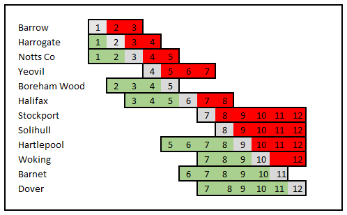 Of the current top 12 Yeovil look the most likely to fall out of the top 3 race but should still secure a play off spot. Stockport and Solihull look likely to fade with Hartlepool and Barnet likely to have strong finishes. Boreham Wood and to some extent Halifax will still have aspirations of a top 3 finish.