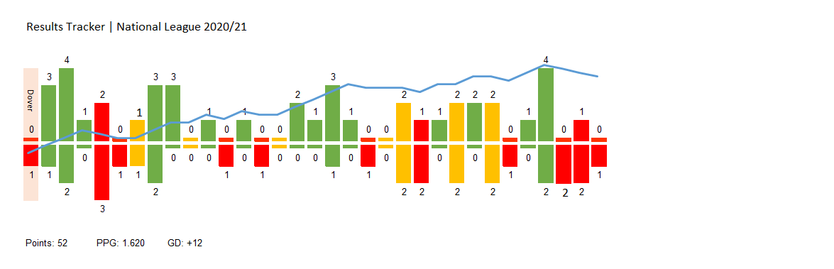 The defeat at Dover is still included in this visual (matches 1-6). No points yet for the first three games in this 6 game segment.