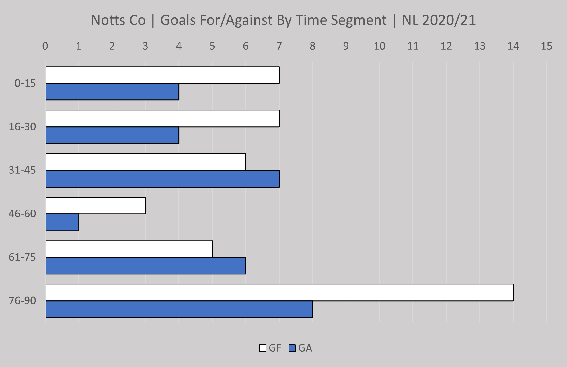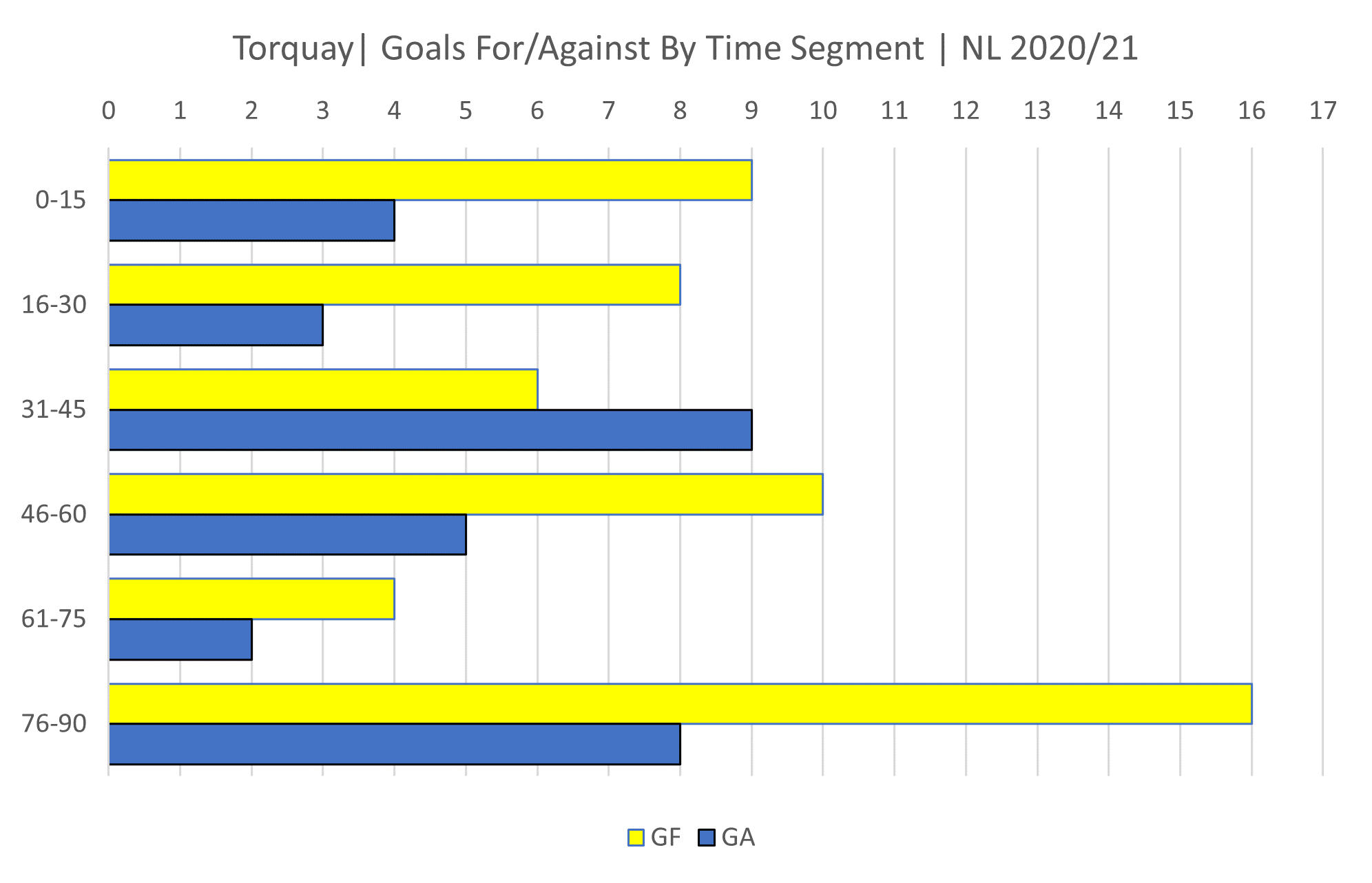 Goals for/against by time segment for Torquay and they do appear to come on strong in the last 15 mins.