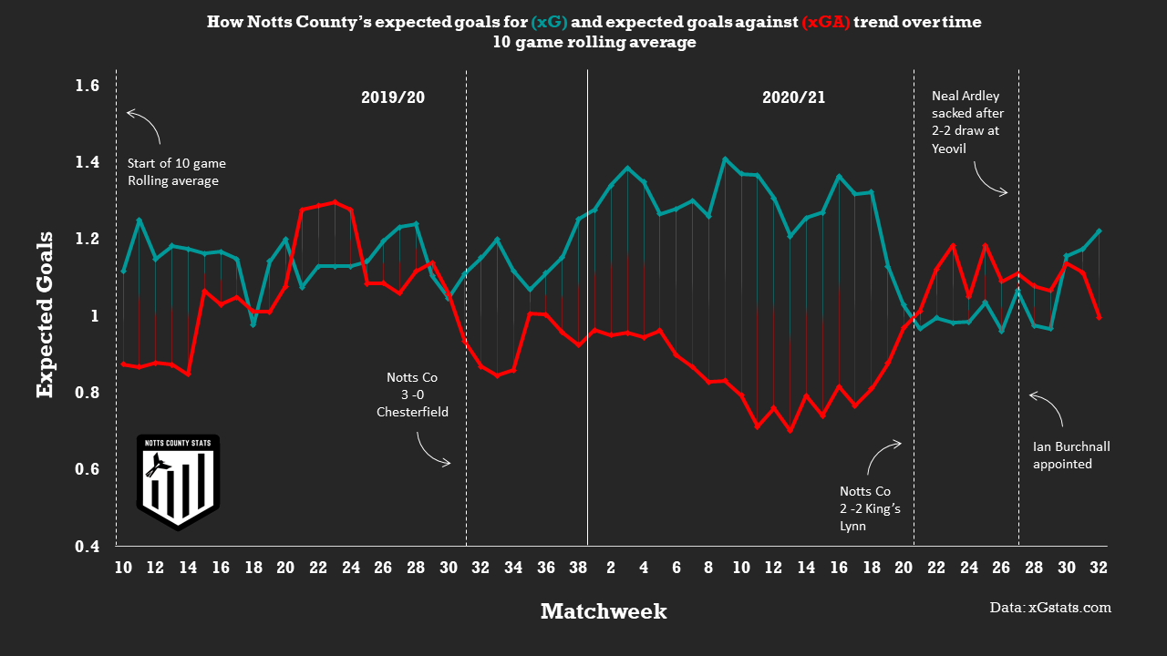 After this win xG continued on a similar trajectory and xGA started to drop slightly suggesting that despite not creating many more chances Notts were more in control of games, making good use of chances created and reducing the number of chances for the opposition.