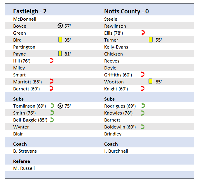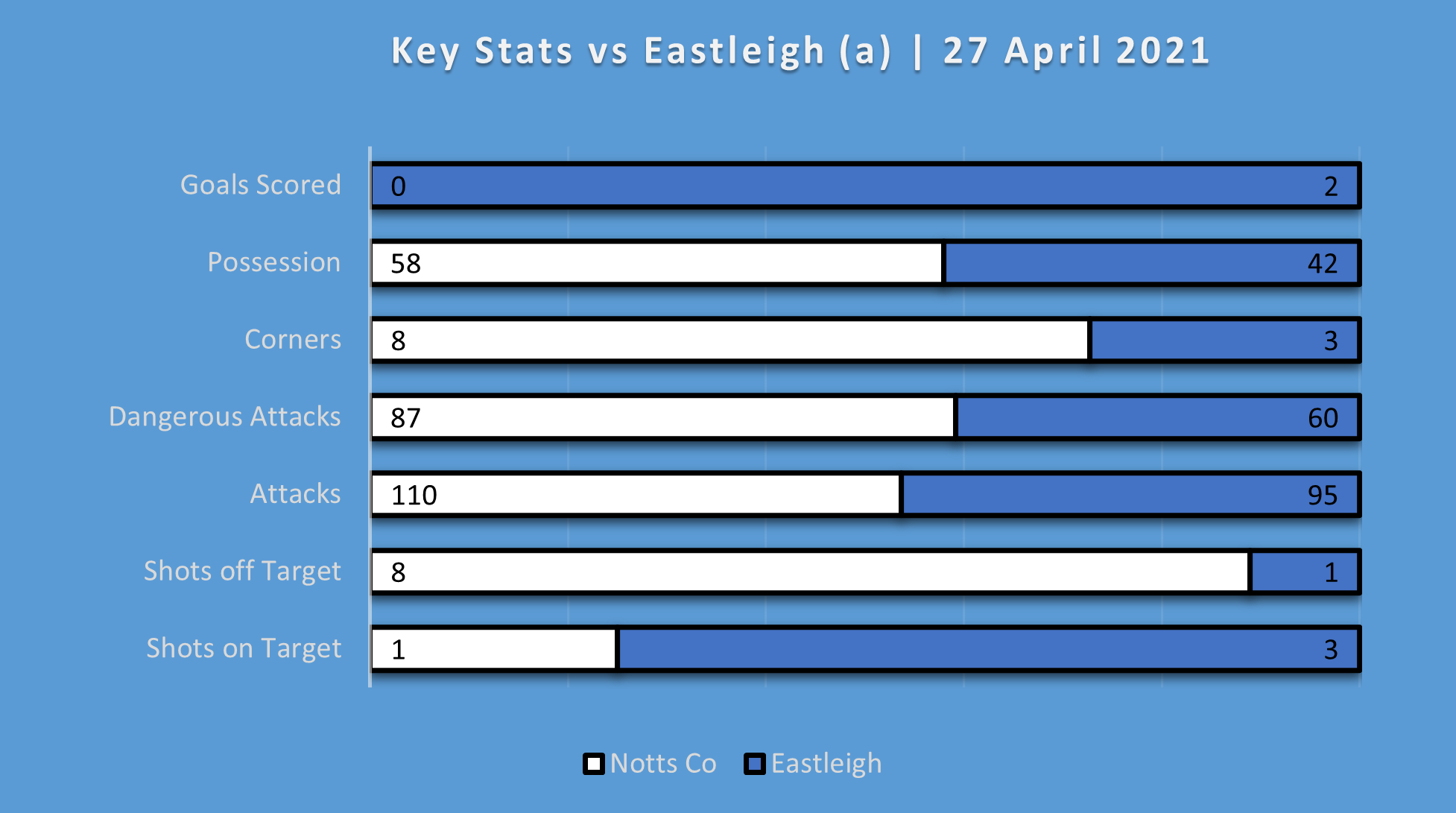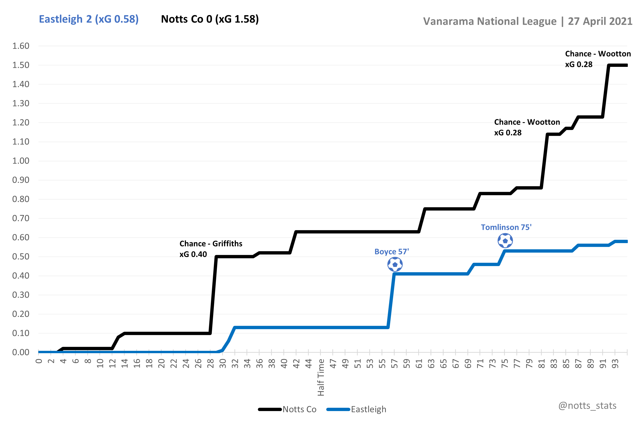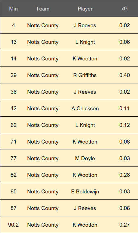 Notts were a constant threat pretty much throughout the whole game recording an xG three times higher than Eastleigh. Griffiths' header that was saved by McDonell was the games biggest chance and Wootton had two good chances late on.