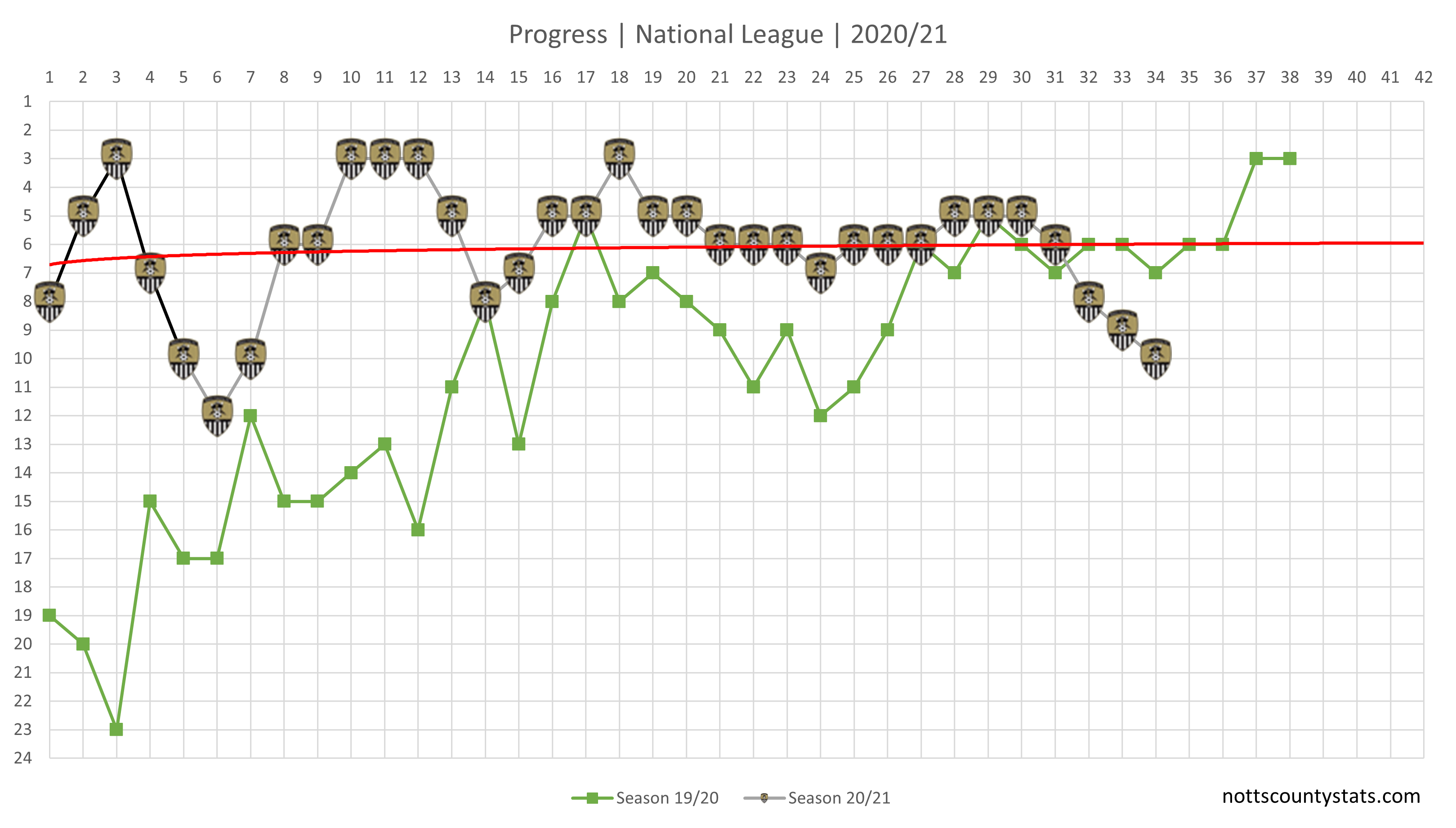 Points needed now with adjusted targets to represent predicted points totals for the current season. As mentioned in the progress chart, despite recent form Notts are still clinging on to a play off spot based on PPG.