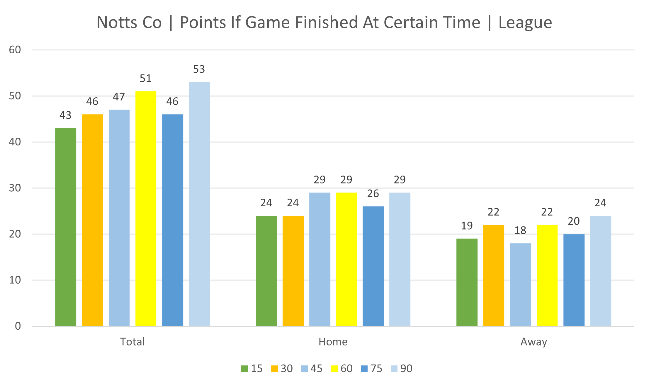 Points by time segment. How many points would have been accumulated if games had finished at 15, 30, 45, 60, 75 and 90 minutes.