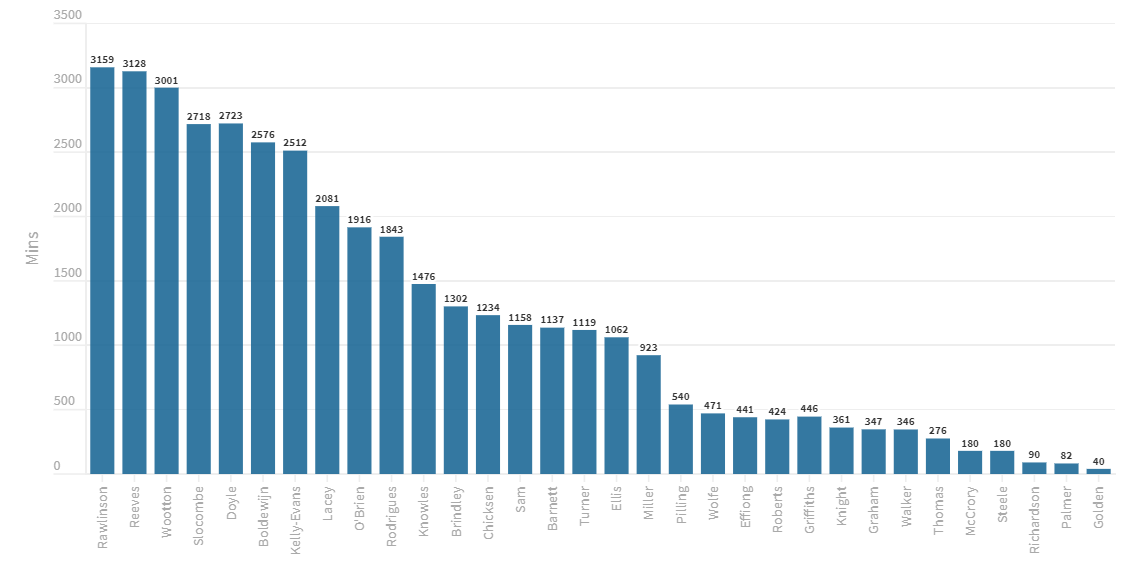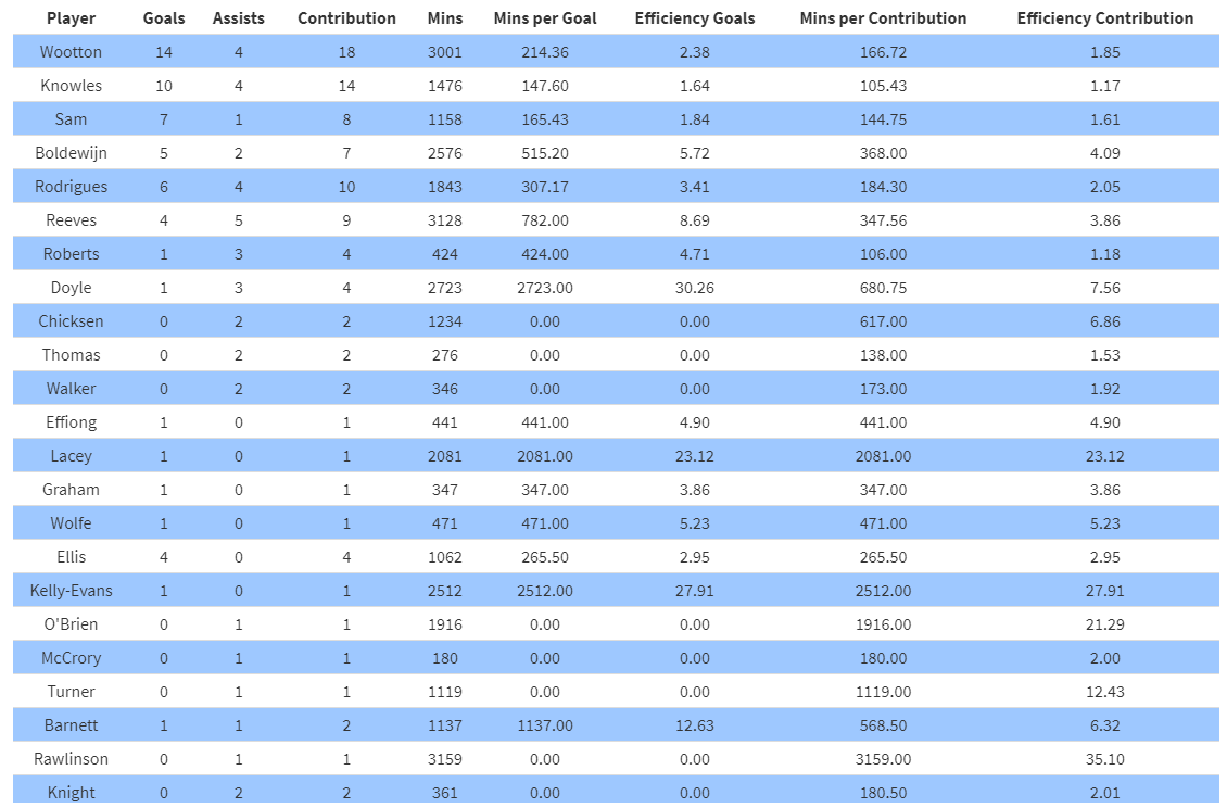 Goal participation by minute detailing player goal contribution efficiency. I'll be looking to change this slightly for next season providing I can obtain more detailed data. This currently takes goals and assists divided by minutes played to provide a value in minutes that shows how many minutes pass between that player being involved in a goal. What I'll be hoping to do is include further detail in this that goes beyond just goals and assists to determine true influence. Watch this space.