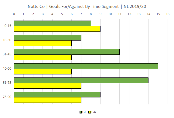 Notts scored 38 goals in the second half of games compared to 26 goals in the first half. Goals conceded have been fairly evenly spread across the 90 minutes suggesting there is no particular time segment where there is a higher risk of leaking goals.