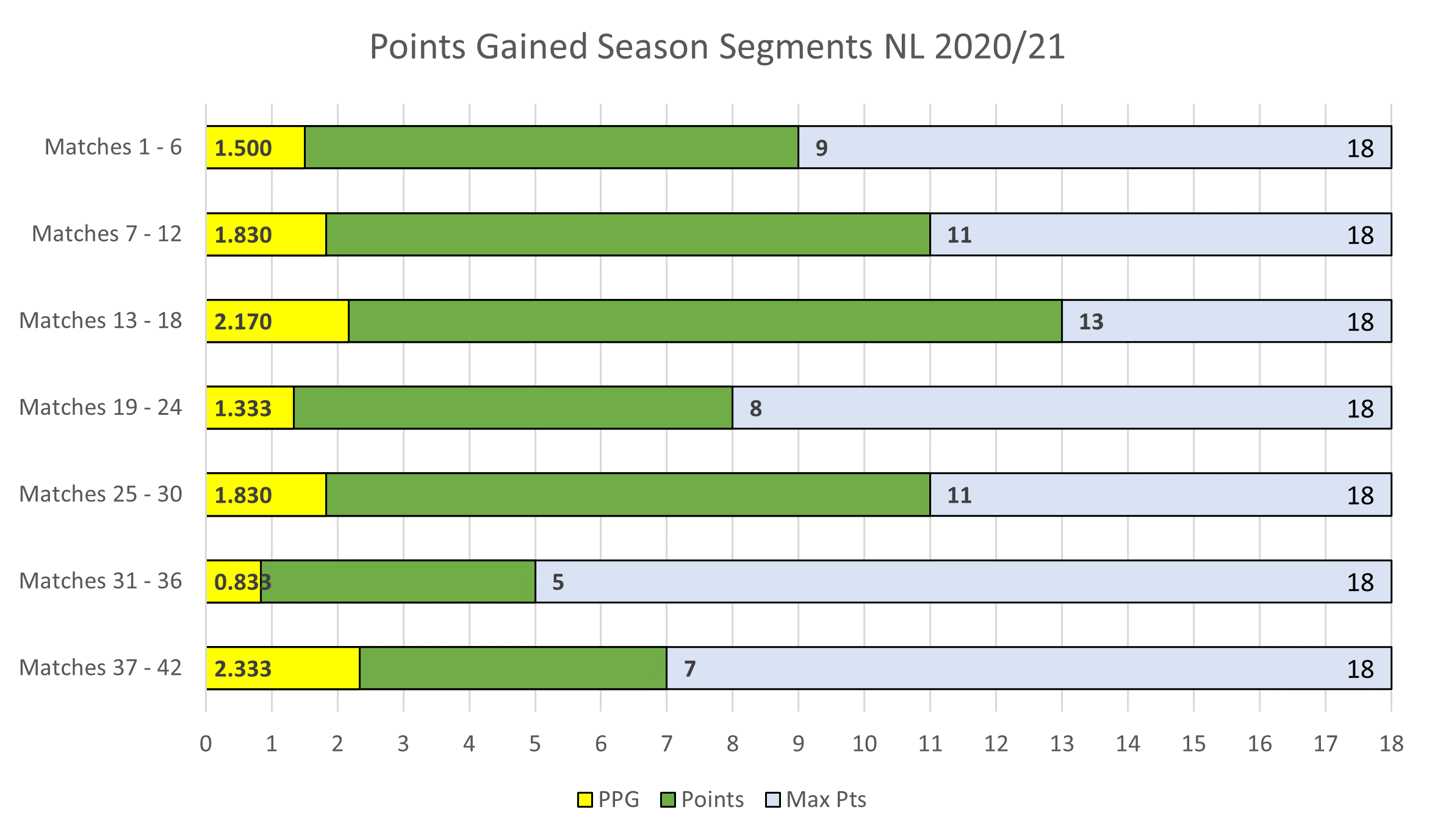 League segment chart updated. Grey bar shows total points available for that segment. Green bar shows total points gained and yellow bar the PPG for that segment.
