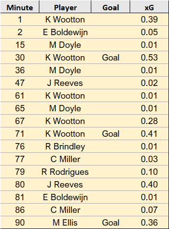 Player xG ratings below for the 17 attempts on goal that Notts had. What is nice to see is the spread of players getting a look in with 8 different players having attempts on goal.