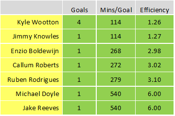 Goal scorers updated and no goals scored means mins/goal stats lengthen for all goal scorers listed except Knowles who didn't feature.
